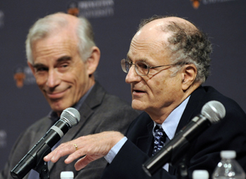 普林斯頓大學(xué)的經(jīng)濟和銀行學(xué)教授克里斯托弗·西姆斯(左)與紐約大學(xué)的經(jīng)濟和商業(yè)學(xué)教授托馬斯·薩金特(右)因在宏觀經(jīng)濟領(lǐng)域所作的研究而共同分享2011年諾貝爾經(jīng)濟學(xué)獎。新華社/EPA歐新 |