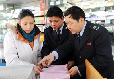 近日,河北省邢臺(tái)市在開(kāi)展對(duì)醫(yī)藥零售企業(yè)的專項(xiàng)整治中,充分利用醫(yī)?ㄖЦ缎畔⒈葘(duì),對(duì)納稅人開(kāi)展調(diào)查核實(shí)和納稅評(píng)估,合理確定醫(yī)保卡支付金額占全部銷售收入的比例,有效規(guī)范了醫(yī)藥批發(fā)零售企業(yè)稅收秩序。圖為邢臺(tái)市橋西區(qū)國(guó)稅局評(píng)估人員在一家藥店通過(guò)收費(fèi)系統(tǒng)核對(duì)醫(yī)?ㄖЦ缎畔⒑蜕陥(bào)等數(shù)據(jù)。