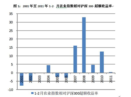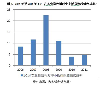 隨著中央對三農問題的重視程度不斷提高,政策頻繁期農業(yè)股表現(xiàn)突出。2007年至今,每年1-2月農業(yè)股相對大盤和相對中小板指數(shù)持續(xù)獲得超額收益。