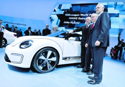 1月9日,在美國密歇根州底特律舉行的2012年北美國際汽車展上,大眾汽車管理層介紹全新“甲殼蟲”E-Bugster汽車。
