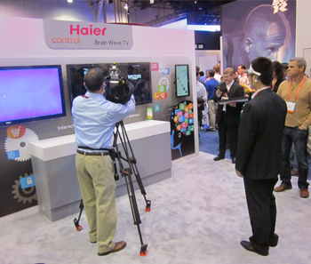 觀眾在2012CES海爾展區(qū),體驗(yàn)不用遙控器的海爾語(yǔ)音控制、手勢(shì)控制、腦力波控制電視。記者 陽(yáng)健