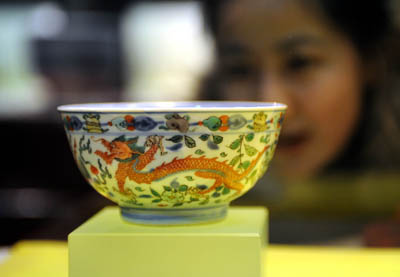圖為觀眾在欣賞參展的明代正德年間的青花紅綠彩云龍紋碗。