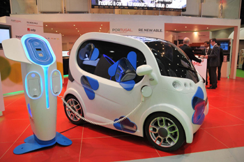 這是1月17日在阿聯(lián)酋首都阿布扎比國(guó)家展覽中心拍攝的一家葡萄牙公司推出的電動(dòng)車。 世界未來能源峰會(huì)第四屆年會(huì)當(dāng)日在阿聯(lián)酋首都阿布扎比國(guó)家展覽中心拉開帷幕。新華社記者