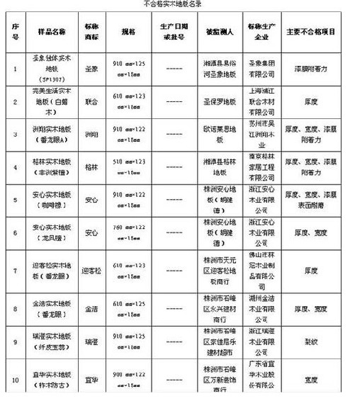 本次實木地板抽樣檢測,從長沙、湘潭、株洲3市的26家經(jīng)銷單位抽取了28個品種的實木地板產(chǎn)品。經(jīng)檢測,合格16組,不合格11組,合格率為59.25%。11組不合格的樣品中,存在的主要問題是厚度、寬度、漆膜附著力三項指標不合格。