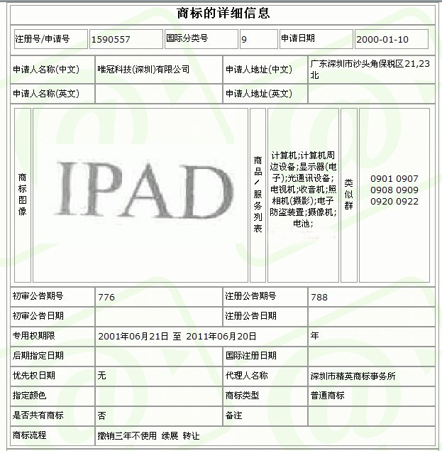 內(nèi)地注冊信息顯示 深圳唯冠在2000年就擁有了iPad注冊商標(biāo)