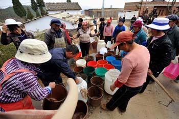 看著僅有的一點(diǎn)水,老母村委會(huì)黨總支書記張海生滿臉愁容。他說(shuō):“這口井有上百年歷史了,是全村700多村民和旁邊小學(xué)近兩百名師生的飲水源泉。歷史上從來(lái)沒(méi)有干涸過(guò),前年特大干旱也沒(méi)有。去年9月以來(lái),我們這里一直沒(méi)有下過(guò)雨,這口百年老井里的水越來(lái)越少,2月以來(lái)一天比一天少,現(xiàn)在已經(jīng)見底了!睘榱私鉀Q飲水難題,老母村委會(huì)組織每天組織村民和學(xué)生附近幾公里外的地方拉水來(lái)喝。張海生說(shuō):“拉水的地方是個(gè)小壩塘,水量很少,最多能再維持一個(gè)星期!