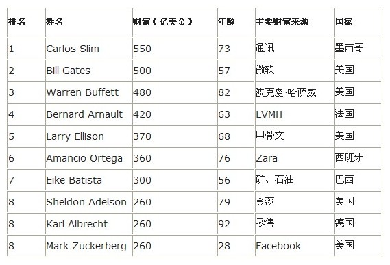 胡潤(rùn)研究院今日發(fā)布2012年全球富豪榜,北美擁有全世界最多的百億美金富豪,墨西哥富豪卡洛斯斯利姆以550億美元成為全球首富。比爾蓋茨以500億美元的財(cái)富排名第二,股神巴菲特480億美元排名第三。