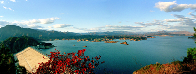 密云水庫是亞洲最大的水庫,有“燕山明珠”之稱。它位于北京東北密云縣城西北,坐落于燕嶺群峰之中,橫截潮、白兩河,環(huán)湖公路110公里,乘車轉一圈需三個多小時。密云水庫是具有防洪、灌溉、發(fā)電和城市用水等綜合功能的特大型水庫,是京城用水最主要的供水源地。