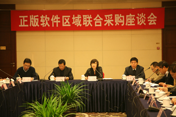 圖為財(cái)政國(guó)庫(kù)司政府采購(gòu)辦公室主任王瑛(左三)、中央國(guó)家機(jī)關(guān)政府采購(gòu)中心主任王力達(dá)(左二)在正版軟件區(qū)域聯(lián)合采購(gòu)座談會(huì)上。資料照片 |
