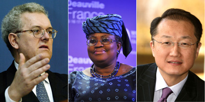 三位候選人分別是:韓裔美籍醫(yī)學(xué)專家、美國(guó)達(dá)特茅斯學(xué)院校長(zhǎng)金辰勇,前世行常務(wù)副行長(zhǎng)、尼日利亞財(cái)政部長(zhǎng)奧孔喬·伊韋拉,前聯(lián)合國(guó)副秘書長(zhǎng)、哥倫比亞前財(cái)政部長(zhǎng)奧坎波。