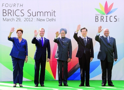 3月29日,金磚國家領(lǐng)導(dǎo)人第四次會晤在印度新德里舉行。這是胡錦濤主席同巴西總統(tǒng)羅塞夫、俄羅斯總統(tǒng)梅德韋杰夫、印度總理辛格、南非總統(tǒng)祖馬合影。