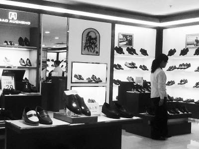 位于王府井步行街的北京百貨大樓利奧納多男鞋專柜,橘色底、黑色線條勾勒的達(dá)芬奇頭像的廣告牌十分醒目。
