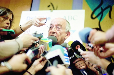 據(jù)外媒報(bào)道,西班牙央行行長(zhǎng)奧德內(nèi)茲(Miguel Angel Fernandez Ordonez)周二(4月10日)在馬德里的一場(chǎng)會(huì)議上說(shuō):“如果西班牙經(jīng)濟(jì)比預(yù)期更為惡化,繼續(xù)給銀行增加資本金將是必要的”。他表示,西班牙經(jīng)濟(jì)不可能在短期內(nèi)強(qiáng)勁反彈。相關(guān)報(bào)道稱,西班牙經(jīng)濟(jì)今年正在走入衰退,政府預(yù)計(jì)經(jīng)濟(jì)將萎縮1.7%。 圖為奧德內(nèi)茲在接受媒體采訪。