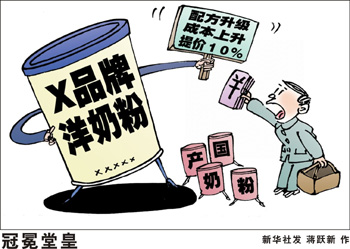 “一罐奶粉的成本不會(huì)超過(guò)100元,可是國(guó)內(nèi)市場(chǎng)上‘洋奶粉’的零售價(jià)動(dòng)輒三四百元,比境外貴一兩倍;還有一些打著‘洋奶粉’旗號(hào)的中國(guó)特供奶,價(jià)格也高得離譜,對(duì)消費(fèi)者產(chǎn)生一定的誤導(dǎo)性。”一位專家抱怨,“洋奶粉”暴利已經(jīng)到了讓人難以置信的地步,但消費(fèi)者對(duì)其肆無(wú)忌憚的連續(xù)漲價(jià)卻束手無(wú)策。 《經(jīng)濟(jì)參考報(bào)》記者了解到,進(jìn)口奶粉量?jī)r(jià)齊增,一方面是需求增加,另一方面則是行業(yè)的暴利驅(qū)使更多企業(yè)進(jìn)口奶粉。值得關(guān)注的是,進(jìn)口奶粉與國(guó)產(chǎn)奶粉的競(jìng)爭(zhēng)正在向中低端延伸。以前,進(jìn)口奶粉主攻高端市場(chǎng),現(xiàn)在各種中小品牌和雜牌“洋奶粉”也蜂擁而至,向中低端市場(chǎng)挺進(jìn),直接蠶食傳統(tǒng)的國(guó)產(chǎn)奶粉市場(chǎng)。