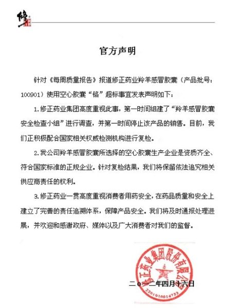 1.修正藥業(yè)集團高度重視此事,第一時間組建了“羚羊感冒膠囊安全檢查小組”進行調(diào)查,并第一時間停止該產(chǎn)品的銷售。目前,我們正積極配合國家相關(guān)權(quán)威檢測機構(gòu)進行復(fù)檢。 2.我公司羚羊感冒膠囊所選擇的空心膠囊生產(chǎn)企業(yè)是資質(zhì)齊全、符合國家標(biāo)準(zhǔn)的正規(guī)企業(yè)。針對復(fù)檢結(jié)果,我們將保留依法追究相關(guān)供應(yīng)商責(zé)任的權(quán)利。 3.修正藥業(yè)一貫高度重視消費者用藥安全,在藥品質(zhì)量和安全上建立了完善的責(zé)任追溯體系,保障產(chǎn)品安全。我們將及時通報處理進展,并歡迎和感謝政府、媒體以及廣大消費者對我們的監(jiān)督。 以下為修正藥業(yè)官方聲明截圖