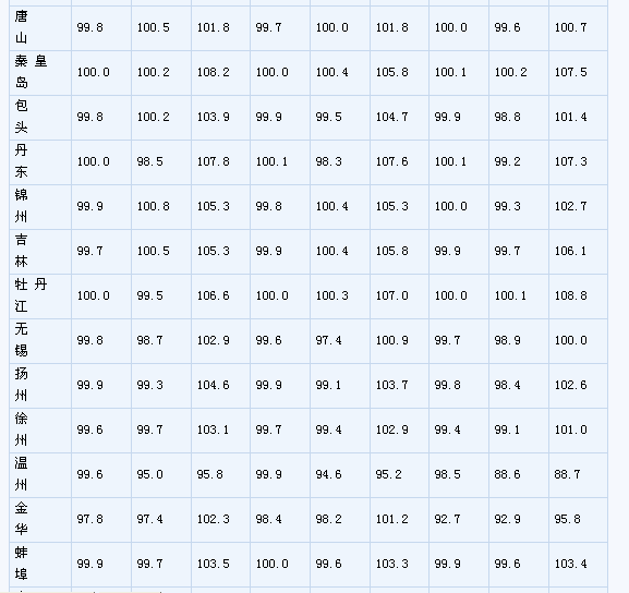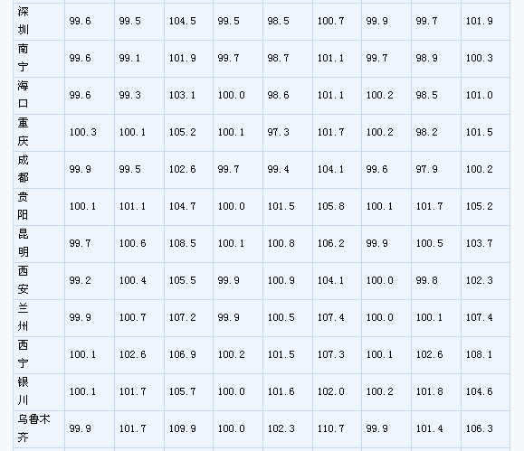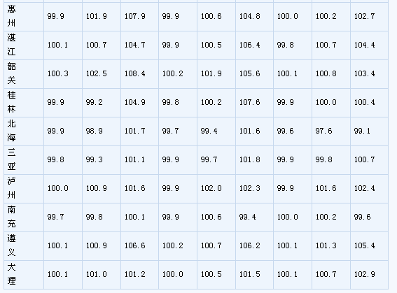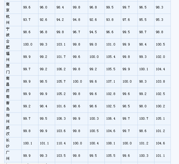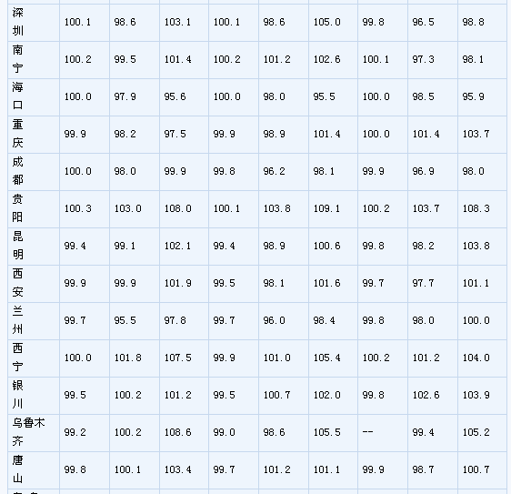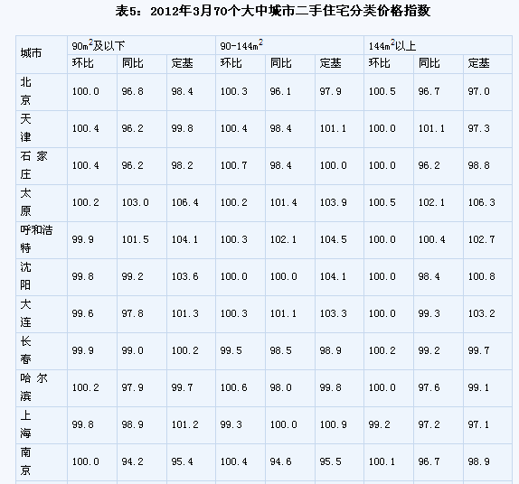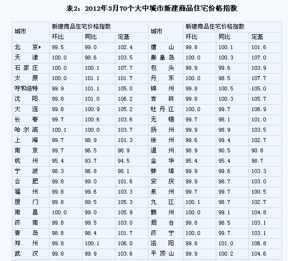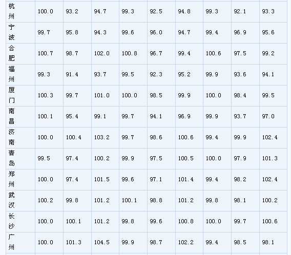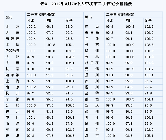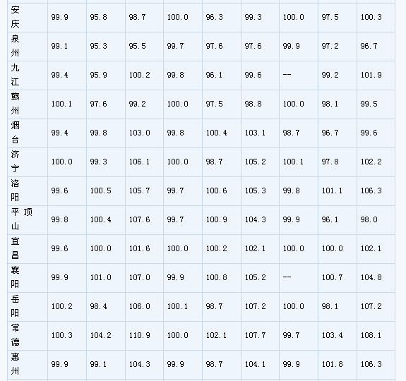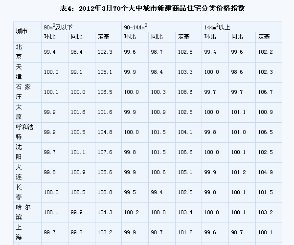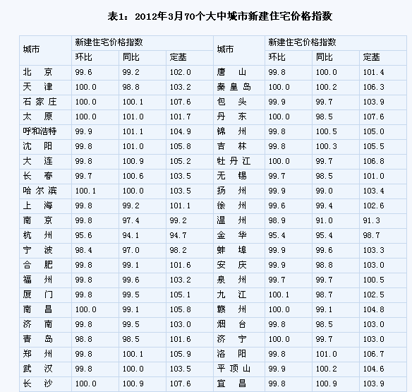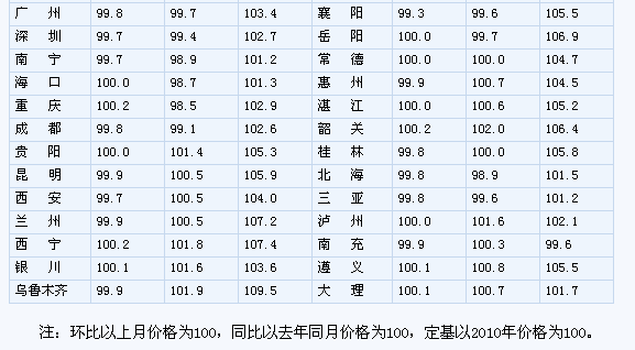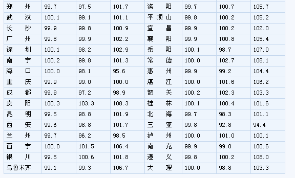 (一)與上月相比,70個(gè)大中城市中,價(jià)格下降的城市有46個(gè),持平的城市有16個(gè),上漲的城市有8個(gè)。環(huán)比價(jià)格上漲的城市中,漲幅均未超過(guò)0.2%。 (二)與去年同月相比,70個(gè)大中城市中,價(jià)格下降的城市有38個(gè),比2月份增加了11個(gè);持平的城市有3個(gè),上漲的城市有29個(gè)。3月份,同比漲幅比2月份回落的城市有21個(gè),漲幅均未超過(guò)2.1%。