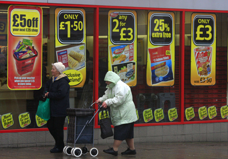 英國國家統(tǒng)計(jì)局25日宣布,根據(jù)初步統(tǒng)計(jì),英國今年第一季度的國內(nèi)生產(chǎn)總值萎縮0.2%。這意味著英國經(jīng)濟(jì)陷入衰退。去年第四季度,英國經(jīng)濟(jì)萎縮0.3%。一般認(rèn)為,連續(xù)兩個(gè)季度的經(jīng)濟(jì)萎縮即意味著一國經(jīng)濟(jì)進(jìn)入技術(shù)性衰退。這也表明,自2008年金融危機(jī)以來,英國經(jīng)濟(jì)再次陷入衰退。今年第一季度,英國制造業(yè)產(chǎn)值下降0.4%,建筑業(yè)產(chǎn)值大幅下降3%,服務(wù)業(yè)產(chǎn)值小幅增長0.1%。 圖為兩位行人從曼徹斯特一家商店大型櫥窗上張貼的降價(jià)廣告前走過。