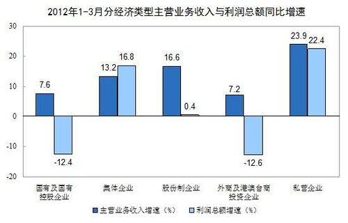 圖為前3月分經(jīng)濟(jì)類型主營(yíng)業(yè)務(wù)收入與利潤(rùn)總額同比增速示意圖
