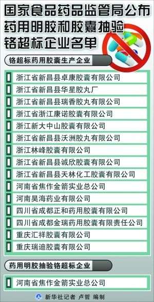 據(jù)國家食品藥品監(jiān)督管理局網(wǎng)站消息,按照企業(yè)全覆蓋、品種全覆蓋、產(chǎn)品批次隨機(jī)抽樣的原則,國家食品藥品監(jiān)管局在全國范圍內(nèi)對藥用明膠和膠囊生產(chǎn)企業(yè)進(jìn)行了全面排查,對18家藥用明膠生產(chǎn)企業(yè)抽驗了166批明膠,檢出1批產(chǎn)品鉻超標(biāo);對117家藥用膠囊生產(chǎn)企業(yè)抽驗了941批藥用膠囊,檢出15家企業(yè)74批膠囊鉻超標(biāo),不合格率為7.9%。