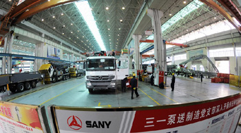 三一集團與擁有世界混凝土機械第一品牌“大象”的德國普茨邁斯特公司聯(lián)合宣布,三一重工在2012年第一季度末完成對普茨邁斯特100%股權(quán)的收購。圖為三一重工泵送制造總裝車間。(新華社