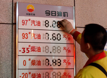 5月10日凌晨,一名工作人員在長春一家加油站內(nèi)更新油價牌。新華社發(fā)(張楠/攝) |