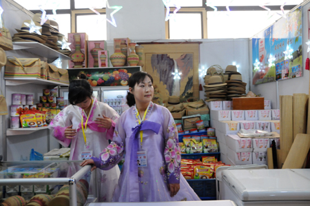 5月14日,兩名身著傳統(tǒng)服飾的婦女在朝鮮首都平壤舉行的第15屆平壤春季國際商品展覽會(huì)上。 第15屆平壤春季國際商品展覽會(huì)14日在平壤三大革命展示館開幕。來自朝鮮、中國、德國、英國、澳大利亞、意大利等16個(gè)國家和地區(qū)的270多家公司參展。展覽會(huì)將展出2100多種產(chǎn)品,包括機(jī)床、電子產(chǎn)品、輕工業(yè)產(chǎn)品、食品和醫(yī)藥制品、化學(xué)制品等。