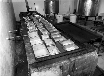 瑞華冷飲廠車間,大池子里盛滿“冷凍液”,冰著半成品。尹亞飛 攝