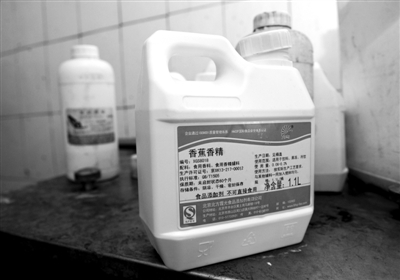 兩個(gè)配料桶之間,擺放著10多瓶各式各樣的食用香精,幾乎涵蓋了所有常見口味,“甜玉米味”、“草莓味”等。