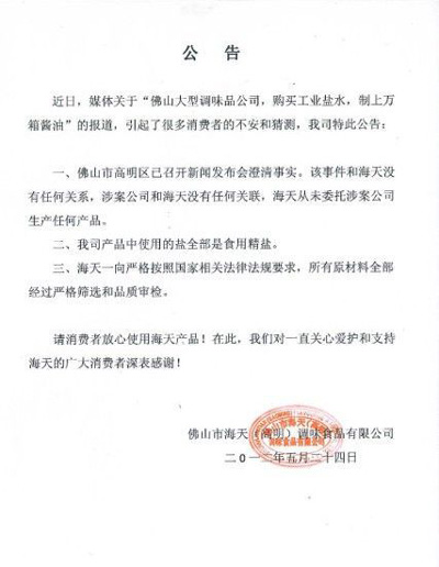 附:佛山市海天(高明)調(diào)味食品公司澄清公告