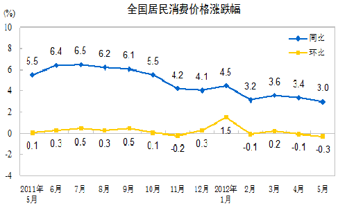 2012年5月份,全國居民消費價格總水平同比上漲3.0%。其中,城市上漲3.0%,農(nóng)村上漲2.9%;食品價格上漲6.4%,非食品價格上漲1.4%;消費品價格上漲3.6%,服務(wù)項目價格上漲1.7%。1-5月平均,全國居民消費價格總水平比去年同期上漲3.5%。