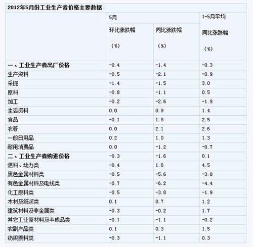 2012年5月份工業(yè)生產(chǎn)者價格變動情況