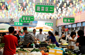 6月9日,市民在山西太原市大營盤菜市場選購食品。當(dāng)日,國家統(tǒng)計(jì)局發(fā)布報(bào)告,5月份全國居民消費(fèi)價(jià)格總水平(CPI)同比上漲3%。新華社記者