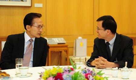 《經(jīng)濟(jì)參考報(bào)》記者13日上午與韓國《每日經(jīng)濟(jì)新聞》等5家媒體在韓國總統(tǒng)府青瓦臺(tái)聯(lián)合采訪了韓國總統(tǒng)李明博。李明博指出,中韓建交短短20年,兩國關(guān)系發(fā)展速度之快、合作之強(qiáng)前所未有。韓國政府愿積極推動(dòng)韓中日自由貿(mào)易協(xié)定(FTA),希望在世界經(jīng)濟(jì)面臨困難時(shí),對(duì)主要國家經(jīng)濟(jì)發(fā)揮積極的作用。