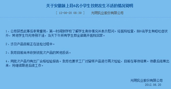 安徽省潁上縣部分學(xué)生食用了光明乳業(yè)配送的牛奶后,78名學(xué)生身體不適,6名學(xué)生出現(xiàn)嘔吐。光明乳業(yè)今發(fā)表公告回應(yīng)稱,這批產(chǎn)品均有出廠合格檢驗(yàn)報(bào)告,沒(méi)收到同批次產(chǎn)品的其他投訴,涉及產(chǎn)品目前正在送檢過(guò)程中。