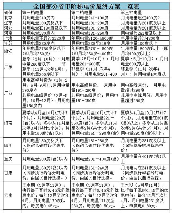 不過針對合表用戶及執(zhí)行居民電價的非居民用戶用電電價方面,浙江、甘肅等省市暫不執(zhí)行階梯電價,部分省市出現(xiàn)不同幅度上調。據中新網報道四川對于合表居民用戶和執(zhí)行居民電價的非居民用戶,每度電在現(xiàn)行合表用戶電價基礎上,按國家規(guī)定順加0.024元執(zhí)行,即每度電0.5464元。重慶合表用戶目前暫不執(zhí)行居民階梯電價,電價每度統(tǒng)一提高2分,即每度0.54元。云南網報道,合表居民用戶,以及執(zhí)行居民生活電價的非居民用戶,均按照每度0.51元執(zhí)行。