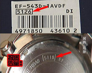 李先生再次仔細(xì)檢查了自己購買的這塊手表之后,又發(fā)現(xiàn)了一個奇怪的問題,這塊表外包裝盒上標(biāo)注的機(jī)芯編號是5126,而手表背面標(biāo)注的機(jī)芯編號卻是5118。這樣的情況再次加深了李先生對于從當(dāng)當(dāng)網(wǎng)購買的這塊卡西歐手表真?zhèn)蔚膽岩伞?BR> 就在這時,李先生想起了在當(dāng)當(dāng)網(wǎng)卡西歐手表的宣傳頁上,大多有“原裝正品,專柜驗貨”的宣傳語,于是李先生拿著自己從當(dāng)當(dāng)網(wǎng)上購買的這塊卡西歐手表,前往北京的卡西歐手表銷售專柜,尋求幫助。