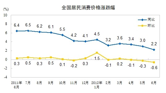 2012年6月份,全國居民消費(fèi)價格總水平同比上漲2.2%。其中,城市上漲2.2%,農(nóng)村上漲2.0%;食品價格上漲3.8%,非食品價格上漲1.4%;消費(fèi)品價格上漲2.3%,服務(wù)項(xiàng)目價格上漲1.9%。上半年,全國居民消費(fèi)價格總水平比去年同期上漲3.3%。