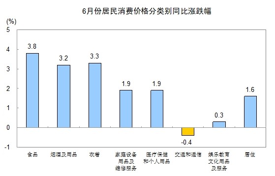 6月份,食品價格同比上漲3.8%,影響居民消費(fèi)價格總水平同比上漲約1.20個百分點(diǎn)。其中,鮮菜價格上漲12.1%,影響居民消費(fèi)價格總水平上漲約0.30個百分點(diǎn);水產(chǎn)品價格上漲8.6%,影響居民消費(fèi)價格總水平上漲約0.21個百分點(diǎn);糧食價格上漲3.2%,影響居民消費(fèi)價格總水平上漲約0.09個百分點(diǎn);油脂價格上漲6.0%,影響居民消費(fèi)價格總水平上漲約0.07個百分點(diǎn);鮮果價格上漲0.6%,影響居民消費(fèi)價格總水平上漲約0.01個百分點(diǎn);肉禽及其制品價格下降1.7%,影響居民消費(fèi)價格總水平下降約0.13個百分點(diǎn)(豬肉價格下降12.2%,影響居民消費(fèi)價格總水平下降約0.43個百分點(diǎn));蛋價格下降3.6%,影響居民消費(fèi)價格總水平下降約0.03個百分點(diǎn)。