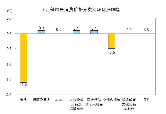 6月份,全國居民消費(fèi)價格總水平環(huán)比下降0.6%。其中,城市下降0.6%,農(nóng)村下降0.5%;食品價格下降1.6%,非食品價格持平(漲跌幅度為0);消費(fèi)品價格下降0.9%,服務(wù)項(xiàng)目價格上漲0.3%。