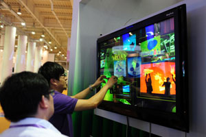 6月15日,在第十屆中國國際軟件和信息服務(wù)交易會(huì)上,參展商向觀眾演示紅外多點(diǎn)觸摸屏。 此屆軟交會(huì)主題為“創(chuàng)新驅(qū)動(dòng)增長,融合深化應(yīng)用——騰‘云’駕‘物’,智能互聯(lián)”。展會(huì)聚焦新一代信息技術(shù)帶來的重大變革和機(jī)遇,解讀新形勢(shì)下的國際合作機(jī)遇和產(chǎn)業(yè)發(fā)展空間,展示技術(shù)創(chuàng)新帶來的全新智能應(yīng)用,展望智慧引領(lǐng)的數(shù)字新未來。記者 潘昱龍/攝 |