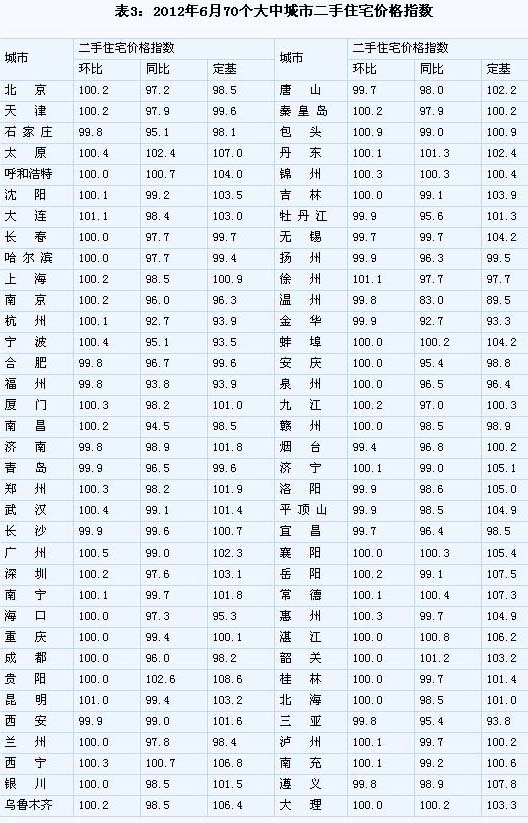 (二)與去年同月相比,70個大中城市中,價格下降的城市有57個,持平的城市有2個,上漲的城市有11個。6月份,同比價格上漲的城市中,漲幅均未超過1.2%,漲幅比5月份回落的城市有6個。