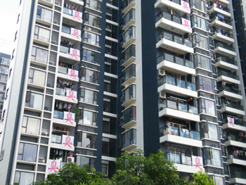 大觀天下小區(qū)業(yè)主在陽臺貼出大幅“臭”字。記者 張鶯/攝 |