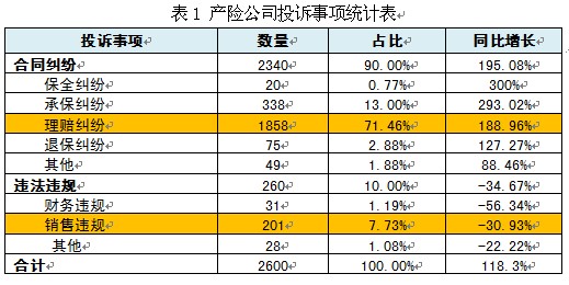 2012年上半年,涉及產(chǎn)險(xiǎn)公司的保險(xiǎn)消費(fèi)者有效投訴事項(xiàng)2600個(gè),同比增長(zhǎng)118.3%,但低于有效投訴事項(xiàng)總量增幅11個(gè)百分點(diǎn)。其中:違法違規(guī)類(lèi)投訴同比下降34.67%,合同糾紛類(lèi)投訴同比增長(zhǎng)195.08%(超過(guò)產(chǎn)險(xiǎn)公司投訴總量增幅76個(gè)百分點(diǎn))。