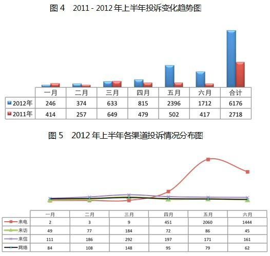 2012年上半年,保監(jiān)會(huì)共接收保險(xiǎn)消費(fèi)者有效投訴件6176件,同比增長(zhǎng)127.23%,反映有效投訴事項(xiàng)共6651個(gè),同比增長(zhǎng)129.42%。其中:信件投訴1118件,占投訴總量的18.10%,同比下降8.51%;網(wǎng)絡(luò)投訴576件,占9.33%,同比下降25.58%;來(lái)訪投訴513件,占8.31%,同比下降18.18%;電話(huà)投訴3969件,占64.26%,與去年同期相比增加3874件。另外,保監(jiān)會(huì)機(jī)關(guān)共接收保險(xiǎn)消費(fèi)者提出的信訪復(fù)查申請(qǐng)8件。