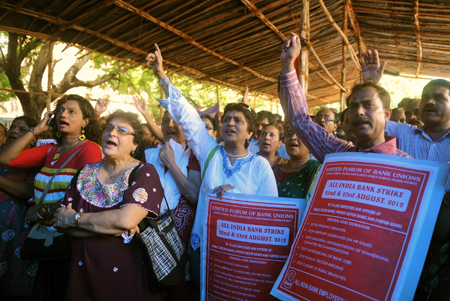 8月22日,印度孟買的銀行業(yè)員工舉行罷工游行。 印度銀行業(yè)大約100萬職員22日開始為期兩天的罷工,抗議印度議會可能批準修改銀行法,放寬銀行業(yè)并購限制同時允許更多私人資本進入這一行業(yè)。