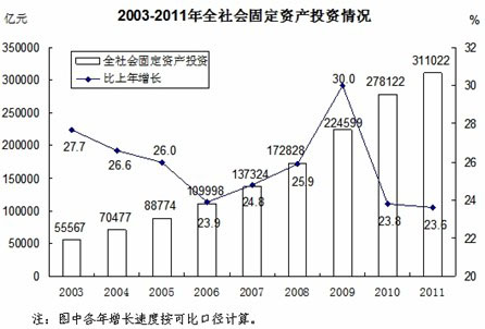 2003-2011年,累計完成全社會固定資產(chǎn)投資1448711億元,年均增長25.6%。年度全社會固定資產(chǎn)投資由2002年的43500億元增加到2011年的311022億元,投資規(guī)模增加了6倍多,是改革開放以來增速較高、持續(xù)時間較長的一個時期。