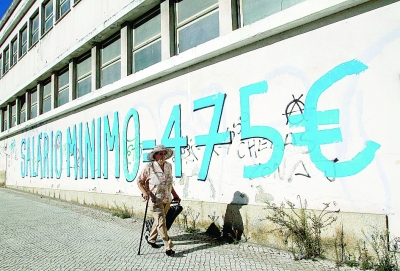 圖為8月26日一名女性走在里斯本街頭,她背后墻上的涂鴉顯示“最低工資475歐元”。