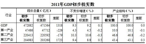 經(jīng)初步核實(shí),2011年國(guó)內(nèi)生產(chǎn)總值現(xiàn)價(jià)總量為472882億元,比初步核算數(shù)增加1318億元,按不變價(jià)格計(jì)算的增長(zhǎng)速度為9.3%,比初步核算數(shù)提高0.1個(gè)百分點(diǎn)。其中,第一產(chǎn)業(yè)增加值為47486億元,比初步核算數(shù)減少226億元,增長(zhǎng)速度為4.3%,比初步核算降低0.2個(gè)百分點(diǎn)。第二產(chǎn)業(yè)增加值為220413億元,比初步核算數(shù)減少179億元,增長(zhǎng)速度為10.3%,比初步核算數(shù)降低0.3個(gè)百分點(diǎn)。第三產(chǎn)業(yè)增加值為204983億元,比初步核算數(shù)增加1723億元,增長(zhǎng)速度為9.4%,比初步核算數(shù)提高0.5個(gè)百分點(diǎn)。按初步核實(shí)數(shù)計(jì)算的三次產(chǎn)業(yè)結(jié)構(gòu),第一產(chǎn)業(yè)占10.0%,第二產(chǎn)業(yè)占46.6%,第三產(chǎn)業(yè)占43.4%。