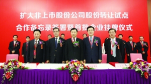 在掛牌儀式上,中國證監(jiān)會(huì)副主席姚剛與北京市常務(wù)副市長李士祥、天津市常務(wù)副市長崔津渡、上海市副市長屠光紹和湖北省副省長趙斌分別簽署合作備忘錄,來自北京中關(guān)村、天津?yàn)I海、上海張江和武漢東湖四家高新技術(shù)園區(qū)的8家公司負(fù)責(zé)人為掛牌交易共同敲鐘。