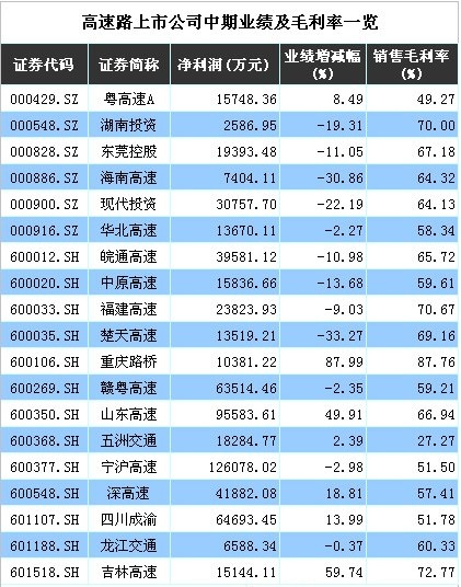 2012年上半年,高速公路上市公司上半年實(shí)現(xiàn)凈利潤(rùn)62.45億元,同比增長(zhǎng)3.52%。整體看,過(guò)半高速路上市公司業(yè)績(jī)出現(xiàn)下降,湖南投資、海南高速、現(xiàn)代投資等11家業(yè)績(jī)出現(xiàn)下降,、楚天高速下降33.27%降幅最大,而重慶路橋則以87.99%的正增長(zhǎng)速度居首。